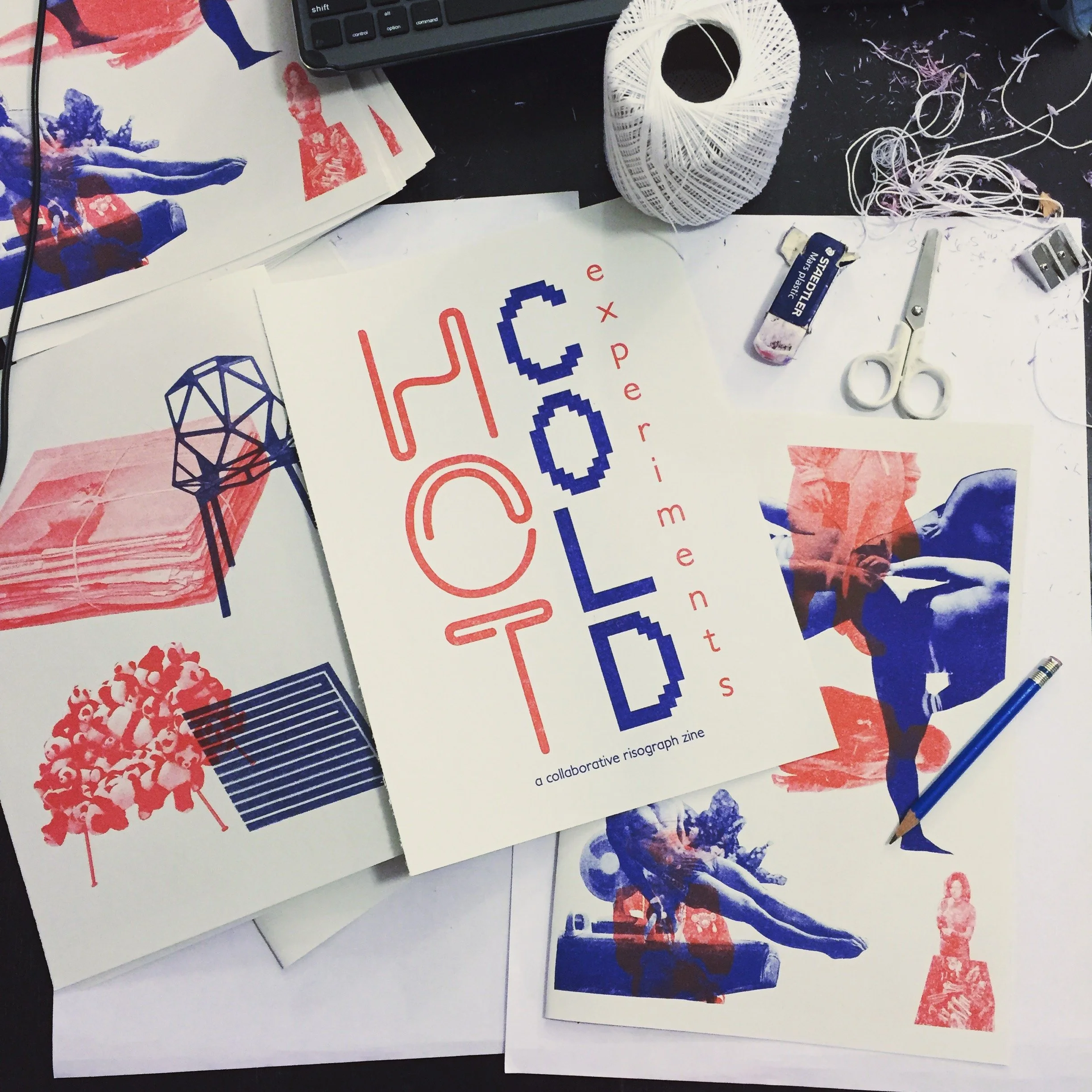 Hot Cold Experiments is a collaborative Risograph zine put together by friends using our (at the time) newly acquired previously loved Risograph RP3700 machine with medium blue and bright red drums. Over pizza, Pocky and refreshments, each person created a page to contribute to the zine. Pages were handbound using Japanese binding techniques.